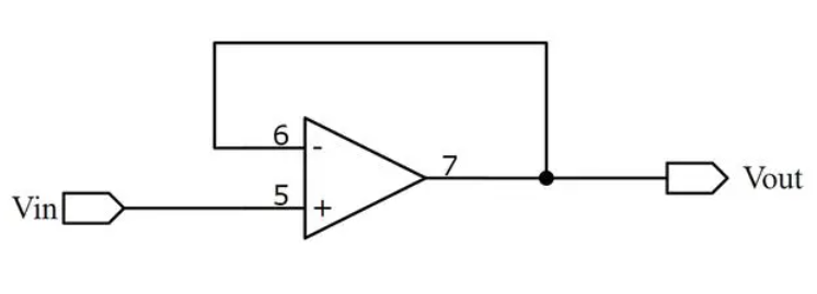 This circuit has a high input impedance, low output impedance, and a voltage gain of 1. This means that the voltage follower has minimal impact on the input voltage signal, and the output voltage is equal to the input voltage. The output current can be relatively large. The following diagram shows a voltage follower implemented using an operational amplifier (op-amp).