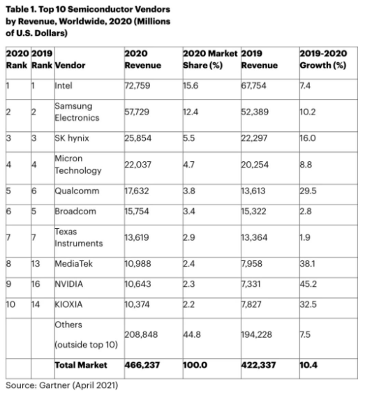 Gartner said that in 2020, global semiconductor revenue totaled 466.2 million US dollars, an increase of 10.4% year-on-year. However, the report does not include revenue generated by pure foundry business, which is dominated by TSMC.