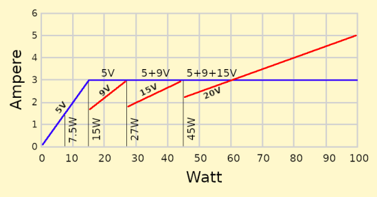 Apple uses the Power Delivery standard, universally recognized by all manufacturers. Power Delivery is a set of specifications for universal USB Type-C chargers that can deliver power between 0.1 W and 100 W. The cable has a major impact: A 3-A cable can handle up to 60 W, while a 5-A cable can handle up to 100 W. A compatible Power Delivery charger adapts to the request of the connected device dynamically, modifying the voltage and current values supplied (see graph in Figure 4). This allows you to adjust the best dispensing procedure in relation to the battery charge and temperature. If the battery is empty, it requires more amperes; if the battery is almost full, on the other hand, charging will be very slow in order not to damage the accumulators. The battery charger adjusts to the condition of the battery. If you use a third-party charger, you will not be able to reach the maximum speed because it “does not recognize” the smartphone connected to it. To understand which profiles are supported, it is very important to read the label of the charger supplied.