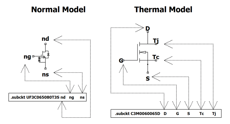 The former, in their internal description in SPICE language, are characterized by the presence of only the electrical and electronic terminals that characterize the component. For example, the following is a UF3C065080T3S MOSFET characterized by only the three terminals: drain (nd), gate (ng), and source (ns).
