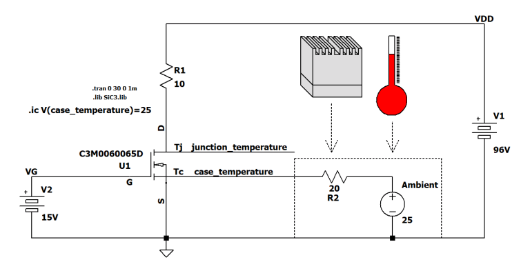 The temperature connections function as the voltage nodes and are electrically separated from the electrical part. A model may have some of these parameters, and not necessarily all of them. Usually, the junction temperature is included in the model, so the user only needs to define a “case temperature” and the ambient temperature. Other times, it is the user who must also define or query the junction temperature. Thermal nodes Tj and Tjd allow the user to easily monitor the simulated junction temperature. Usually, these nodes shouldn’t be connected. The thermal node Tc contains the temperature information on the case of the component.