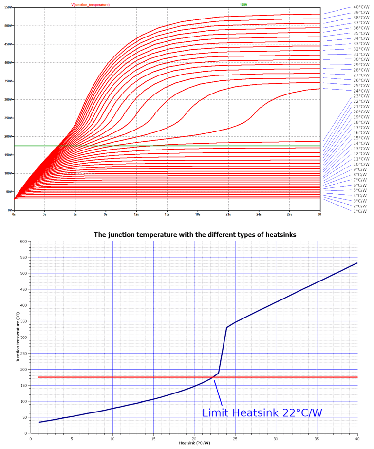In any case, the component works regularly, as its junction temperature is below the maximum limit of 175°C. With the heatsink of 20°C/W, the operation of the MOSFET is almost at the limit. Note that the graph shows voltage as a unit of measurement, but in reality, the temperature is being measured. If no heatsink is used, or if its measurements and performance are reduced (for example, 20°C/W), the MOSFET will be destroyed after 7 seconds and the theoretical thermal equilibrium point is over 500°C.