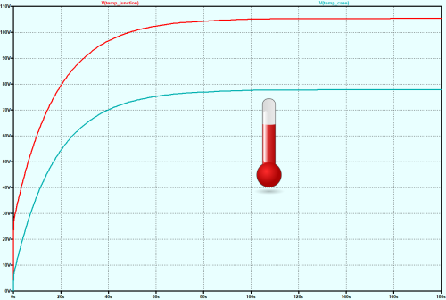 To check the temperature of the component’s “case” (as well as the temperature of the MOSFET junction), simply click on the line that connects the node “Tc” with the heatsink, as shown in the wiring diagram.