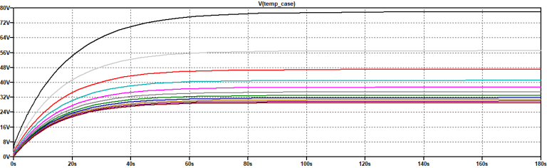 Let’s take a closer look at the graph. The curves are calculated in the time domain, and the temperature is represented on the x-axis, though in volts. With an ambient temperature of 25˚C (previously set in the parameters of the SOAtherm model), the equilibrium point is reached after about two minutes (120 seconds). The heatsink allows the MOSFET to operate safely, and the operating temperatures of the device at the end of the thermal transient are as follows: